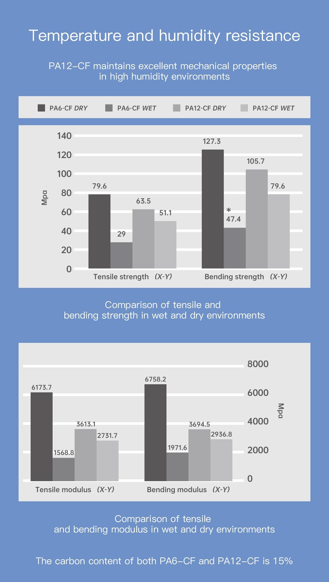 - 【Low Moisture Sensitivity】PA12-CF based on modified PA12 long-chain nylon, whose saturated moisture absorption rate is only one tenth of ordinary PA6, completely solving the defects of the mechanical properties and dimensional stability of nylon materials that change greatly after absorbed moisture.